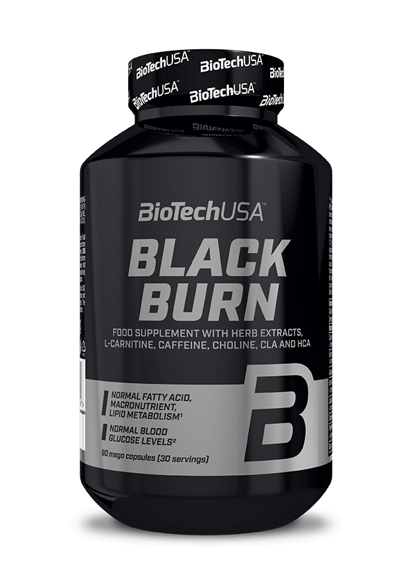 BLACK BURN – Suplemento alimentar à base de extratos vegetais, L-carnitina, colina, inositol, CLA, HCA, aminoácidos, vitaminas e minerais, com cafeína. O crómio contribui para o normal metabolismo dos macronutrientes e para a manutenção de níveis normais de glicose no sangue. O zinco contribui para o normal metabolismo dos ácidos gordos. Contém cafeína (200 mg/3 cápsulas). Não recomendado a crianças, nem a mulheres grávidas ou lactantes.