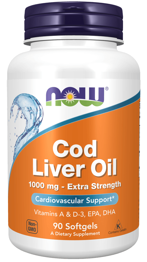 NOW® Cod Liver Oil Extra Strength contém 1000 mg de Óleo de fígado de Bacalhau. Saúde Cardiovascular. Vitaminas A e D3 com elevada biodisponibilidade. Fonte de Ácidos Gordos Ómega-3: EPA e DHA. Obtido por destilação molecular. Manutenção da pressão arterial normal. Elevada pureza, livre de contaminantes.