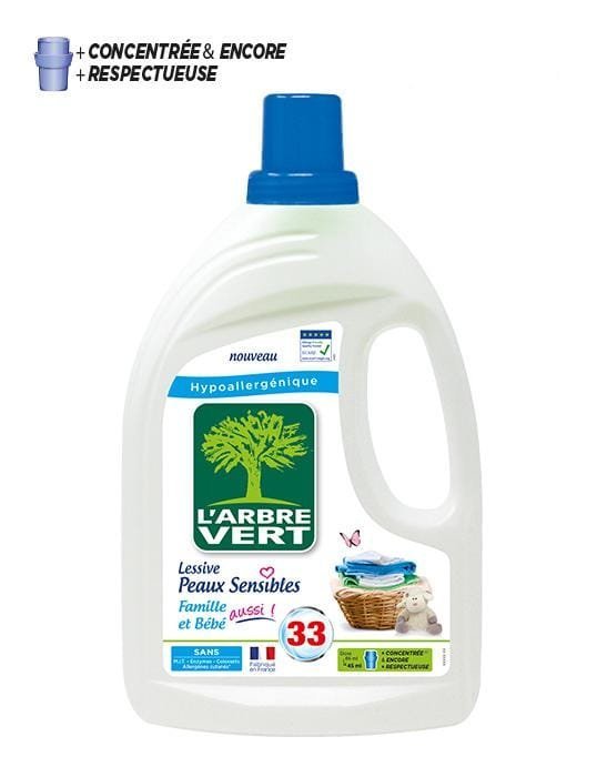 O detergente de roupa líquido L’Arbre Vert respeita as pessoas e o meio ambiente. É adequado para lavar tecidos brancos e de cores.