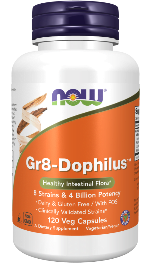 NOW® Gr8 Dophilus contém Probióticos e Prebióticos- flora intestinal saudável (disponibiliza a microflora diretamente no Intestino resistindo à acidez do suco gástrico). 8 linhagens e 4 milhares de milhões de bactérias probióticas. Elevado aporte de probióticos. Fructooligosacáridos (FOS) com potência e pureza garantidas (auxiliam e aceleram o crescimento saudável das bactérias probióticas). Muito eficaz em casos de diarreia, tratamento com antibióticos, processos inflamatórios (colites) e mau funcionamento intestinal. Estável à temperatura ambiente (não necessita de refrigeração). Revestimento entérico (resiste à acidez do suco gástrico, atingindo o Intestino inalterado).