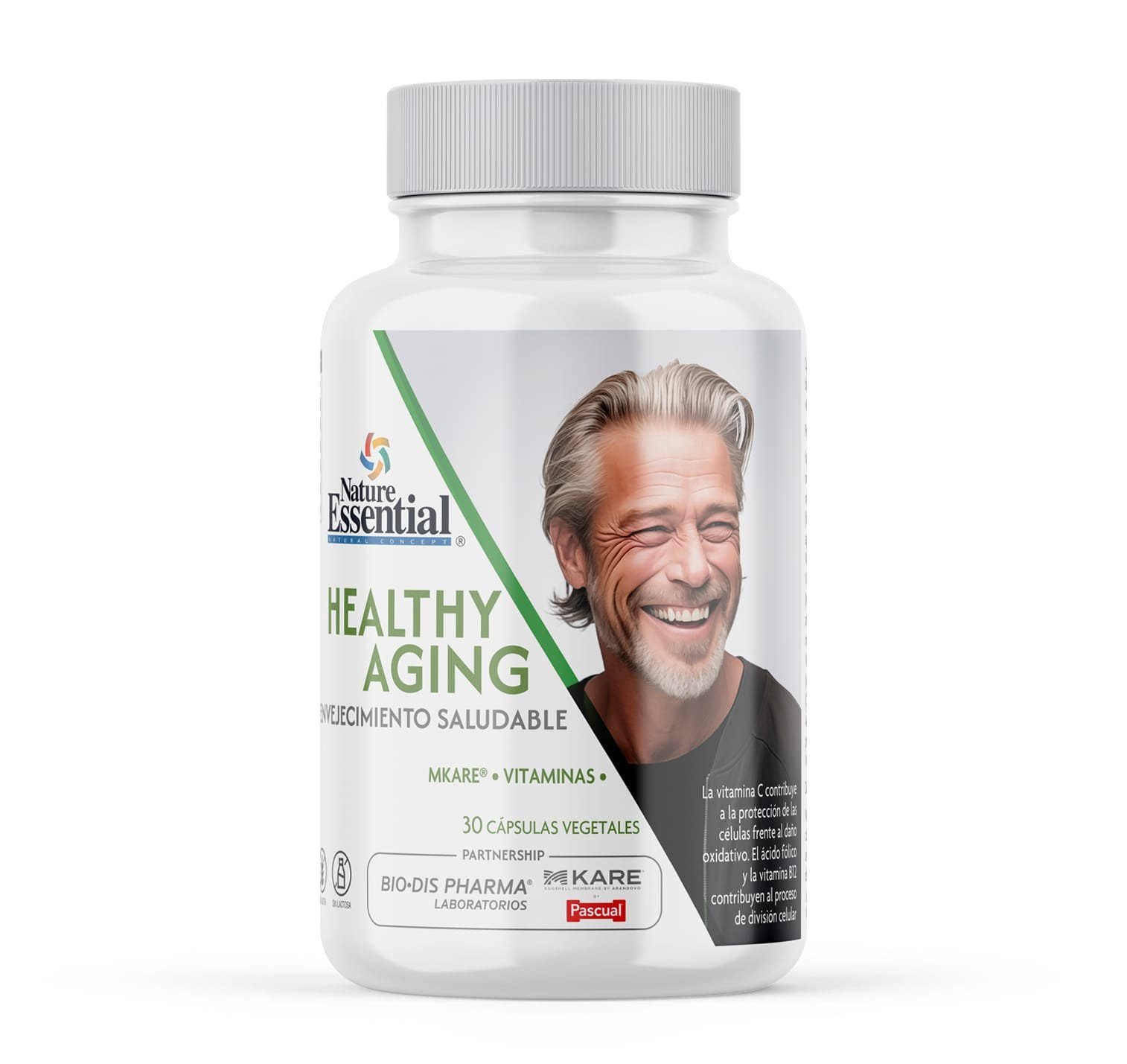 Healthy Aging Envelhecimento Saudável Nature Essential é formulado com membrana de ovo MKare®, vitamina C, vitamina B6, ácido fólico, vitamina K2, vitamina D3 e vitamina B12, que têm propriedades antioxidantes, regeneradoras dos tecidos e aliviam a inflamação e a dor nas articulações.